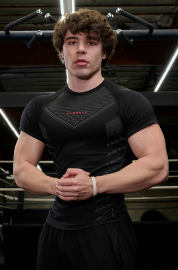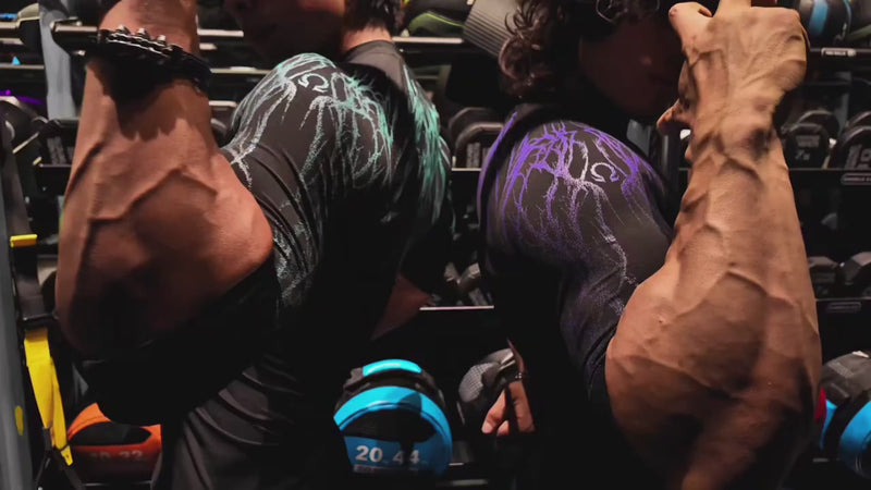 Esta camiseta de compresión se cerca con un patrón estructurado, estilo blindado. Es ligero, de...